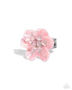 Featuring a warped shell-like texture, an oversized light pink flower glimmers atop the finger for a whimsical finish. Dainty silver studs and clear crystal beads coalesce the center of the flower, adding additional tactile detail. Features a stretchy band for a flexible fit.