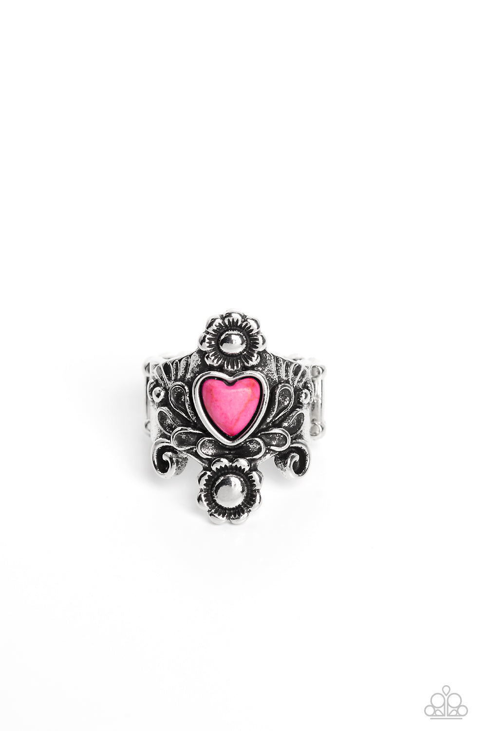 Dotted with a refreshing pink heart stone center, glistening silver floral filigree climbs up and down the finger, coalescing into a whimsical, earthy frame. Features a stretchy band for a flexible fit. As the stone elements in this piece are natural, some color variation is normal.