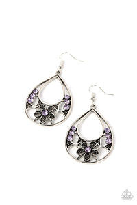 Dotted with dainty purple rhinestones, a fractured floral pattern blooms inside an airy teardrop frame for a whimsical fashion. Earring attaches to a standard fishhook fitting.