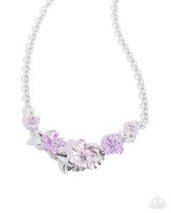 Dotted with silver-studded centers, metallic light purple and lavender flowers bloom and alternate along the neckline. Each flower, varying in size, blossoms across a textured collection of silver leaves below the collar, invoking a festive spirit. Features an adjustable clasp closure.