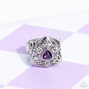 A triangular cut purple rhinestone adorns the center of a decorative silver frame swirling with filigree details. The ornate centerpiece sits atop matching silver frames, coalescing into a regal band. Features a stretchy band for a flexible fit.