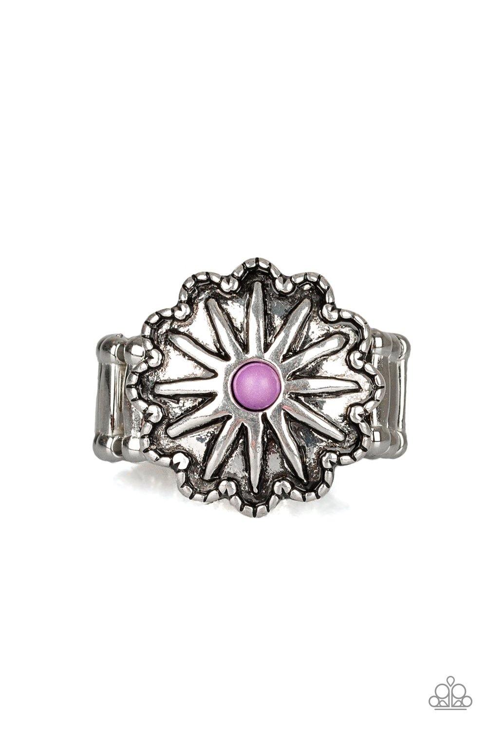 A dainty purple stone bead is pressed into the center of an antiqued silver frame radiating with floral detail for a seasonal flair. Features a stretchy band for a flexible fit.