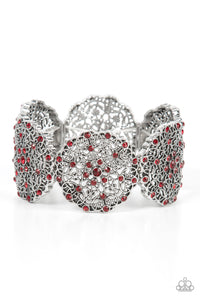 Dotted with fiery red rhinestones, studded silver frames are filled with mandala-like filigree details and threaded along stretchy bands around the wrist for a glitzy pop of color.