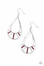 Sections of glittery red rhinestones and shimmery silver bars flare out from the bottom of a glistening silver teardrop, coalescing into an airy frame. Earring attaches to a standard fishhook fitting.