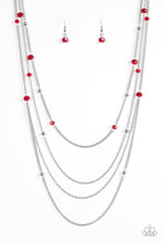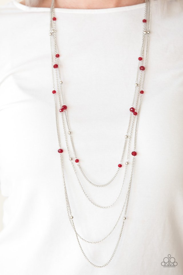 Faceted red crystal-like beads and dainty silver beads trickle along shimmery silver chains for a glamorous look. Features an adjustable clasp closure.