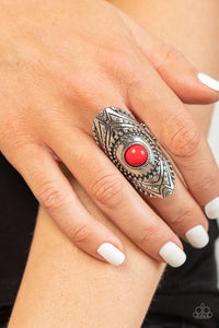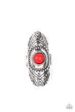 A fiery red stone creates a colorful centerpiece for an oversized elongated silver frame. Embellished with studded texture and geometric designs, the patterned frame results in a hypnotizing lure atop the finger. Features a stretchy band for a flexible fit.