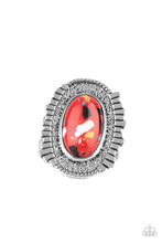 Featuring a colorful terrazzo finish, an earthy red stone adorns the hammered center of an oversized silver frame adorned in an asymmetrical silver fringe for a hint of artisan edge. Features a stretchy band for a flexible fit.