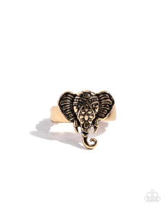 A delicately detailed gold elephant, with intricately embossed patterns on its head and ears, rests on a dainty gold band. Features a stretchy band for a flexible fit.