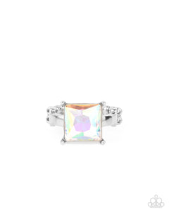Featuring a regal princess cut, an oversized iridescent rhinestone shines brilliantly atop a dainty silver band for a sparkly finish. Features a dainty stretchy band for a flexible fit.