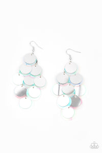 A bubbly collection of oversized silver and iridescent sequins cascade from the ear, creating a flirty holographic fringe. Earring attaches to a standard fishhook fitting.