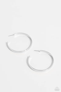 Radiating with high-sheen detail, a sleek, thick silver hoop curls around the ear for a classic, staple look. Earring attaches to a standard post fitting. Hoop measures approximately 1 3/4" in diameter.
