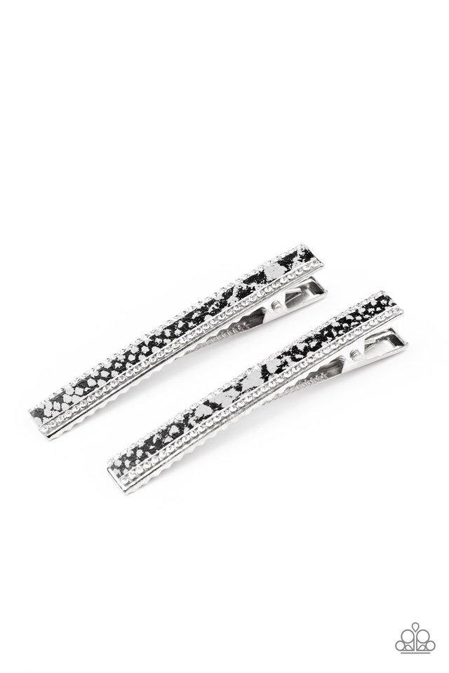 Bordered in glassy white rhinestones, a strip of black and gray python print leather embellishes the front of a rectangular silver frame for a wild look. Features a standard hair clip on the back.