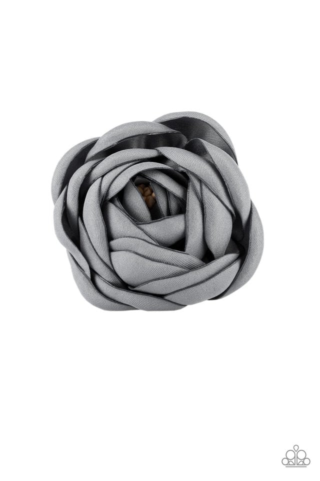 Soft gray petals fold around a lifelike beaded center, gathering into a beautiful rosebud. Features a standard hair clip on the back.