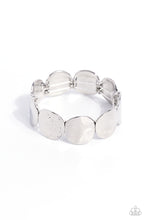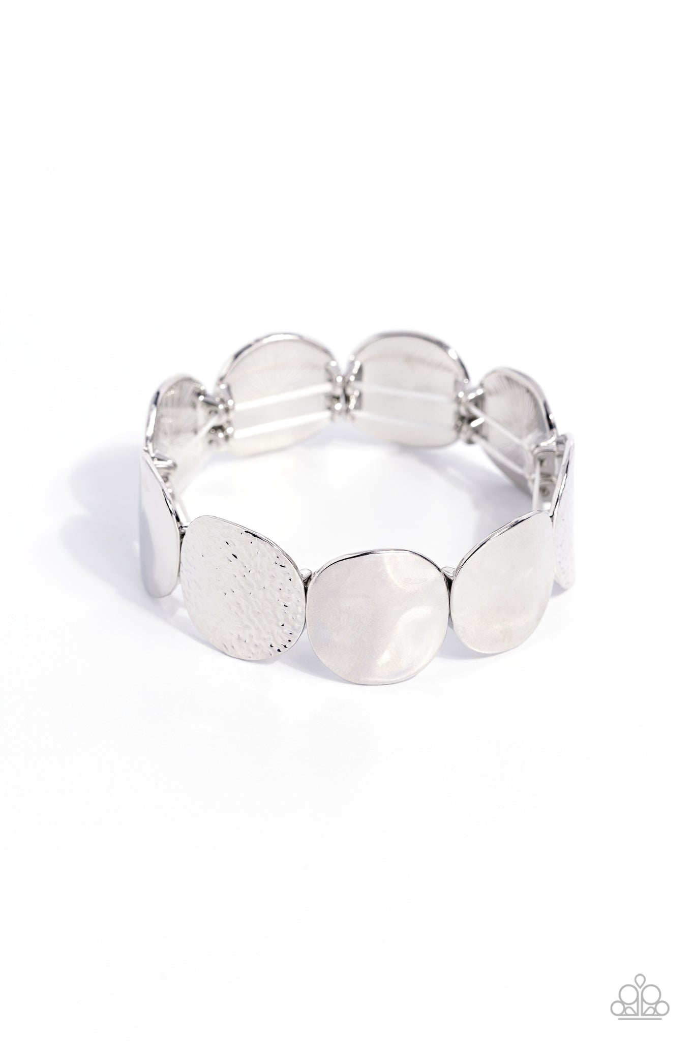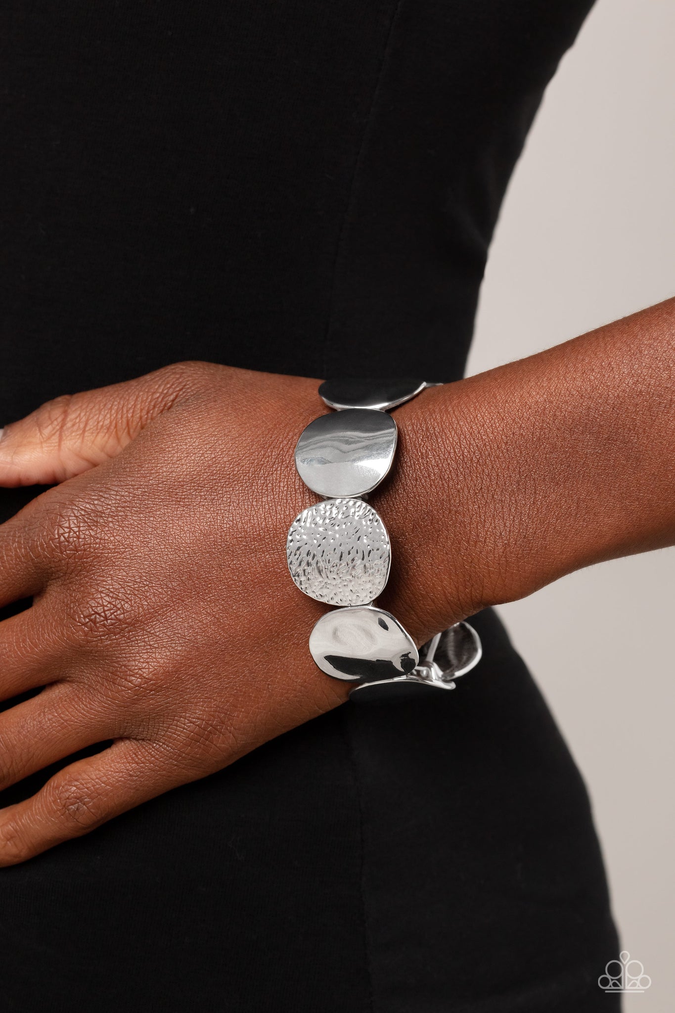 A hammered collection of asymmetrical silver discs are threaded along stretchy bands around the wrist for a refined flair. The silver discs feature both a rippling hammered effect and a more subtle hammered effect, creating a fashionable contrast amidst the same color.