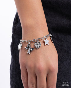 Swaying along a glistening silver cable chain, a collection of Cheerleading-inspired charms including a silver megaphone with the word "cheer", a white heart gem in a silver frame, a silver bow with the word "cheer", a white rhinestone-embellished silver heart, a silver star with the word "go team," and a silver heart collect along the wrist. Features an adjustable clasp closure.