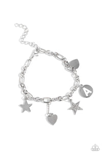 A strand of silver chain is decorated with sentimental charms, including a white rhinestone-encrusted and sleek silver star, a hammered and sleek silver heart, and a white-painted "A" silver pendant for a charismatic display around the wrist. Features an adjustable clasp closure.