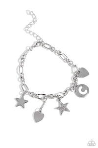 A strand of silver chain is decorated with sentimental charms, including a white rhinestone-encrusted and sleek silver star, a hammered and sleek silver heart, and a white-painted "C" silver pendant for a charismatic display around the wrist. Features an adjustable clasp closure.