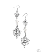 Embellished with white rhinestones, marquise-cut white gems, white teardrop gems, and an emerald-cut gem two silver frames connected by a trio of pearls in varying sizes flair out along the ear for a classy, chic look. Earring attaches to a standard fishhook fitting.