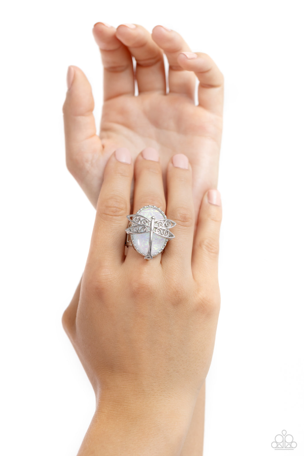 Centered atop a white opalescent refracted shimmer oval, an ornate, silver dragonfly rests atop a silver serrated frame, creating a whimsically seasonal statement atop airy silver bands on the finger. Features a stretchy band for a flexible fit. Due to its prismatic palette, color may vary.