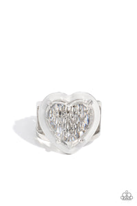 A faceted crystal-like white heart gem is pressed into pronged-fittings atop airy silver bands. A border of white paint encircles the dazzling heart for a romantic centerpiece atop the finger. Features a stretchy band for a flexible fit.