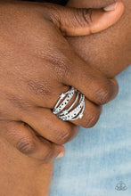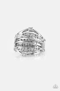 Mismatched silver bands arc across the finger, coalescing into an airy frame. Dainty white rhinestones are sporadically sprinkled across the shimmery layers for a refined finish. Features a stretchy band for a flexible fit.
