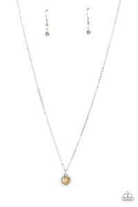Bordered in glassy white rhinestones, a dainty yellow rhinestone heart sparkles along a dainty silver chain below the collar for a flirtatious fashion. Features an adjustable clasp closure.
