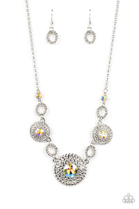 Airy silver petals delicately bloom inside twisted silver hoops below the collar. Dotted with iridescent yellow rhinestone centers, the flowery frames gradually increase in size as they link with twisted silver oval rings and glittery yellow iridescent rhinestones for an out-of-this-world statement. Features an adjustable clasp closure. Due to its prismatic palette, color may vary.