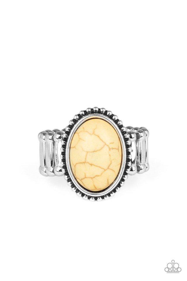 Chiseled into a smooth oval, a sunny yellow stone is pressed into the center of a studded silver frame for an artisan inspired look. Features a stretchy band for a flexible fit. Sold as one individual ring.