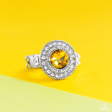 Featuring a pronged silver fitting, an oversized yellow gem sits atop a radiant ring of glassy white rhinestones for a timeless fashion. Features a dainty stretchy band for a flexible fit.