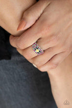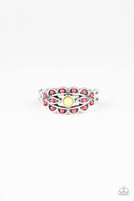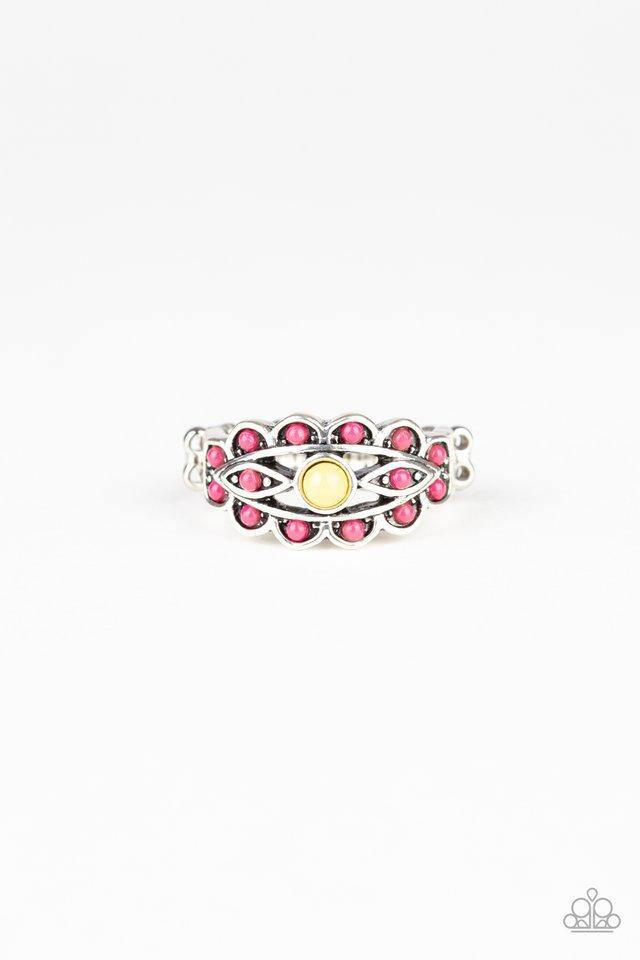 Dotted in dainty yellow and Pink Peacock beads, an antiqued silver band blooms into a flowery frame across the finger. Features a dainty stretchy band for a flexible fit. Sold as one individual ring.