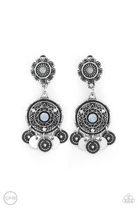 Dainty silver discs and antiqued floral frames dance from the bottom of an ornately embossed silver frame that links to a matching silver fitting. Both frames are dotted in blue opalescent rhinestone centers, while the largest of frames is sprinkled in dainty white rhinestone accents for a dreamy finish. Earring attaches to a standard clip-on fitting.