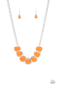 Dewy orange teardrop gems are nestled inside pronged silver frames that delicately connect below the collar, creating an ethereal centerpiece. Features an adjustable clasp closure.