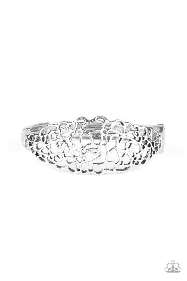 Glistening silver bars coalesce into an airy stenciled cuff-like bracelet around the wrist for a whimsical metallic look. Features a hinged closure.