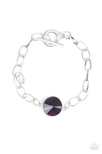 A dramatic purple gem attaches to a shiny silver chain, creating a blinding centerpiece atop the wrist. Features a toggle closure.