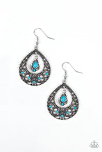 Featuring refreshing blue beaded accents, an ornate silver frame swings from the top of a larger frame dotted in matching blue beads for a whimsical look. Earring attaches to a standard fishhook fitting.