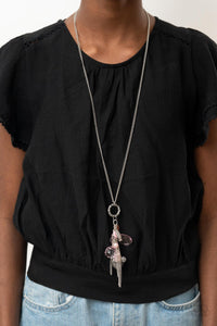 Varying glassy, pearly, opaque, and shell-like finishes, a whimsical collection of pink crystal-like and classic beads delicately cluster along a silver chain swinging from the bottom of a textured silver ring. Mismatched silver beads, classic silver chains, and a decorative silver locket-like bead are added to the fringe, creating an enchanting tasseled pendant at the bottom of a classic silver chain. Features an adjustable clasp closure.