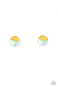 A dainty round frame is painted in Green Ash, Cerulean, Marigold, and white geometric sections, creating an abstract display. Earring attaches to a standard post fitting.