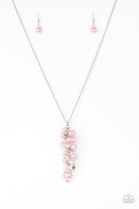 Mismatched pink pearls, white crystal-like beads, and faceted silver beads cascade from the bottom of an elongated silver chain, creating a refined clustered tassel. Features an adjustable clasp closure.