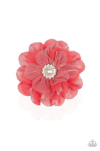 Overlapping coral chiffon and lacy white petals are dotted with a pearl and rhinestone encrusted centerpiece for a refined flair. Features a standard hair clip on the back.