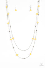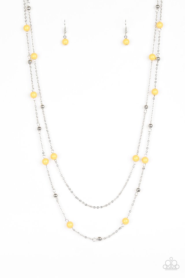Sunny yellow and dainty silver beads trickle along two shimmery silver chains, creating colorful layers down the chest. Features an adjustable clasp closure.