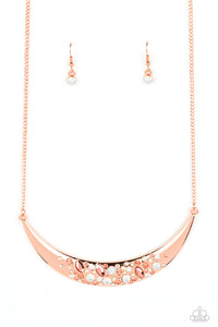 A stunning collection of round opalescent gems, topaz gems, dainty opalescent rhinestones and marquise cut coppery rhinestones shimmer across the surface of a shiny copper crescent. The bejeweled plate falls just below the collar in a dazzling finish. Features an adjustable clasp closure.