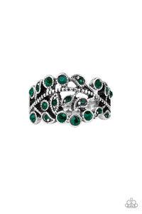Dotted in dainty green rhinestones, leafy silver bands stack across the finger, coalescing into a whimsically layered band. Features a dainty stretchy band for a flexible fit.