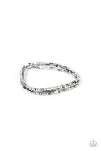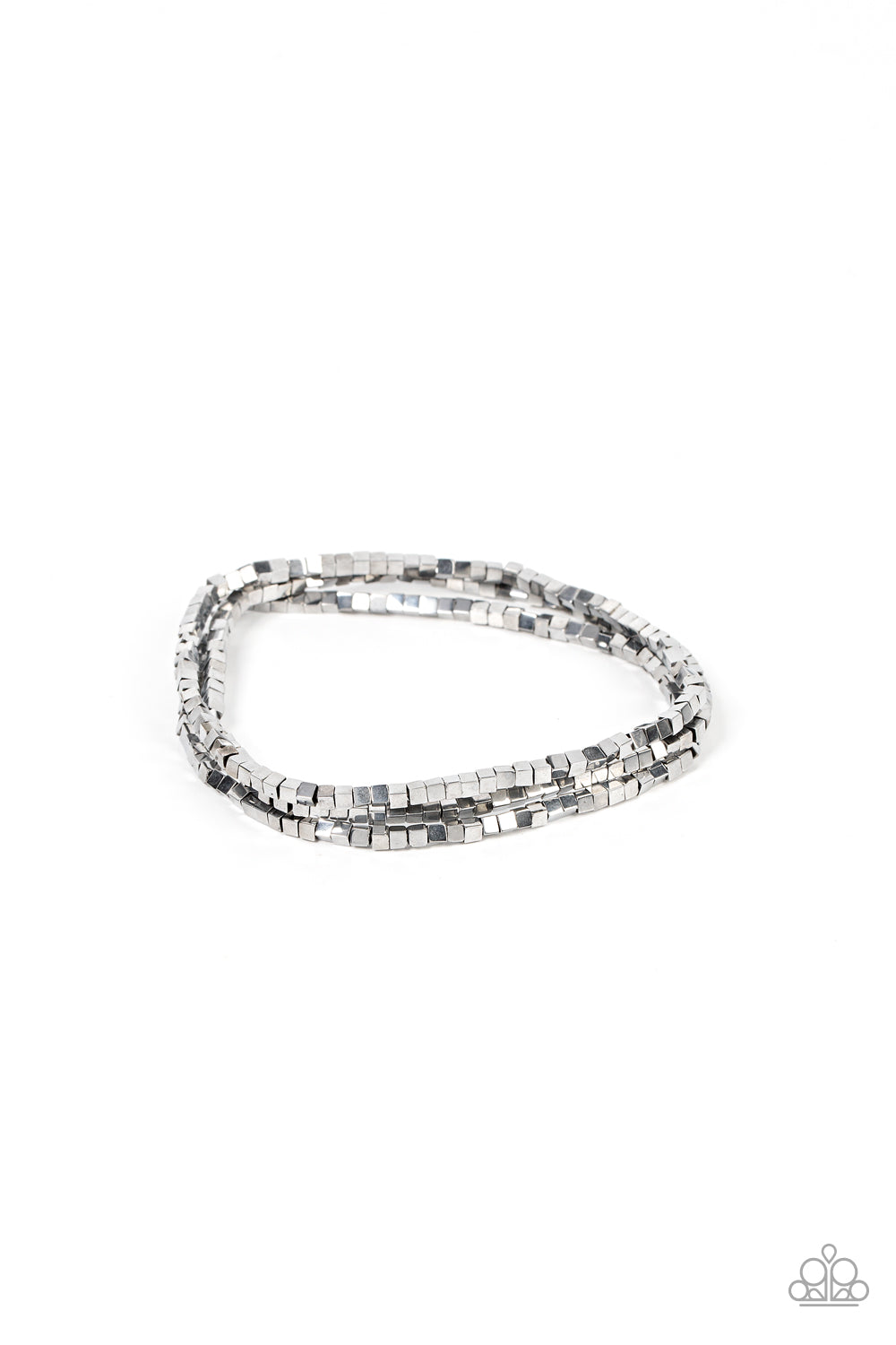 A dainty collection of silver cube beads alternates along stretchy bands, stacking into edgy layers around the wrist.