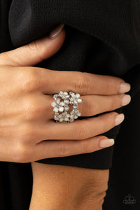 A whimsical collection of glassy white beads and shiny white floral frames dot three shimmery silver bands across the finger, coalescing into a colorful centerpiece. Features a stretchy band for a flexible fit.