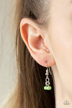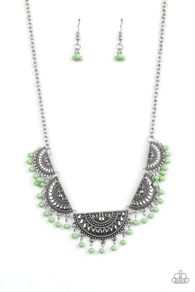 Embossed in tribal inspired patterns, silver half-moon frames link below the collar. Dainty green beads swing from the bottoms of the ornate frames, creating a flirtatious fringe. Features an adjustable clasp closure.