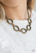 Bold brass links join with topaz rhinestone encrusted frames below the collar for a fierce look. Features an adjustable clasp closure.