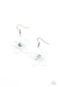 A dainty white rosebud blooms from the center of a layered white wire flower, creating a beautiful floral frame. Earring attaches to a standard fishhook fitting.