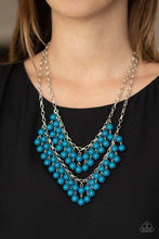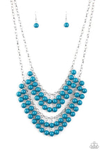Pairs of Mosaic Blue beads cascade from the bottoms of two silver chains, creating a vivaciously layered fringe below the collar. Features an adjustable clasp closure.