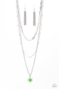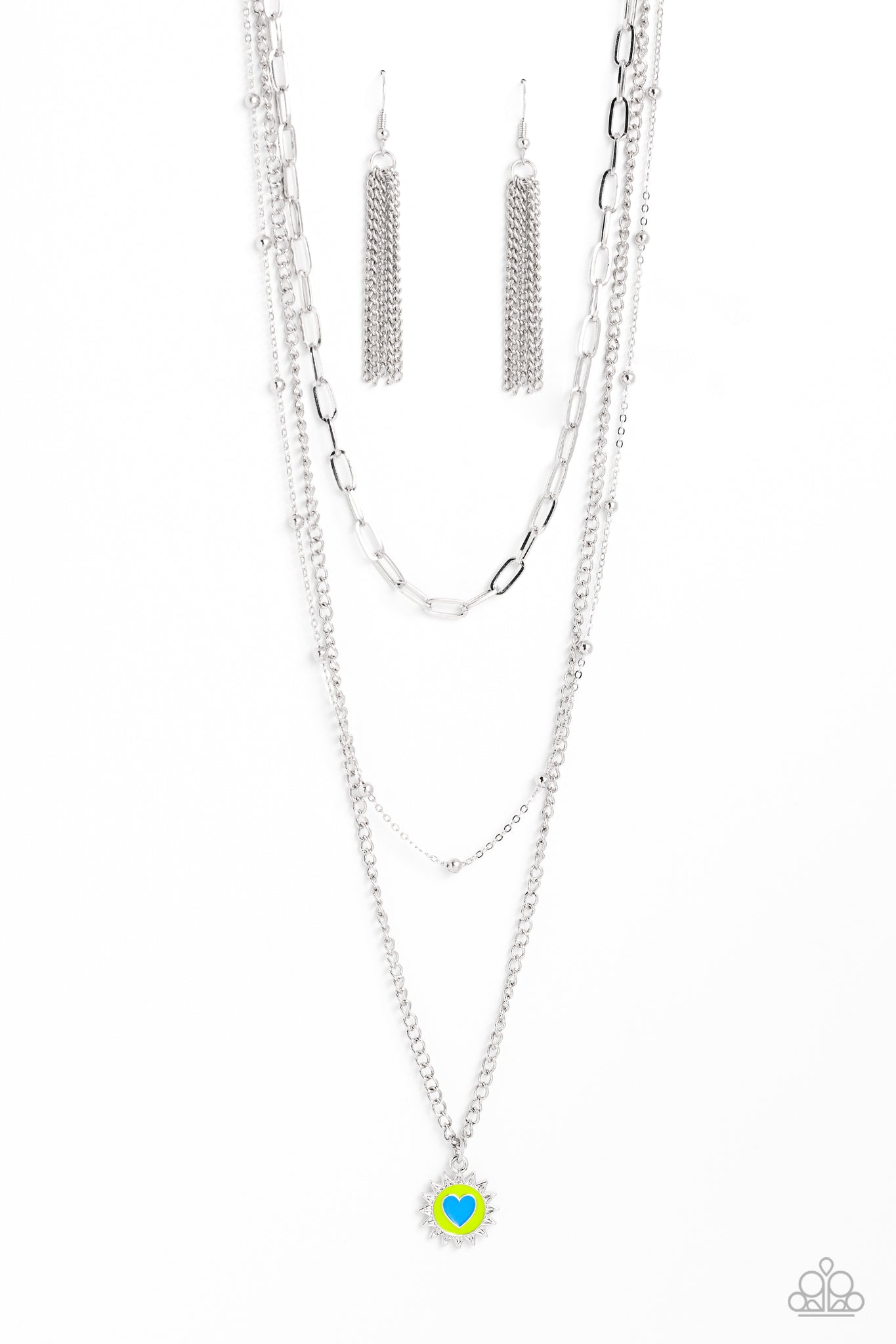 Three silver chains cascade in various lengths across the chest, creating a radiantly edgy display. The centermost chain is dotted with silver studs while a sunburst silver frame, embellished with a Love Bird center and a blue painted heart, creates a youthful pendant at the bottom of the longest chain in a colorful finish. Features an adjustable clasp closure.