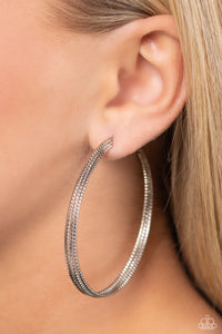 Cut in tactile texture, three silver bars delicately stack and curve into a layered hoop for an edgy urban look. Earring attaches to a standard post fitting. Hoop measures approximately 2 1/2" in diameter.